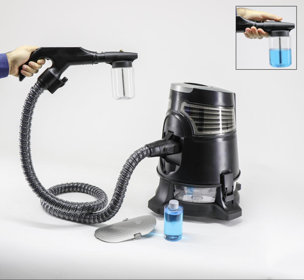 Dès que Roboclean est en marche, le flux d’air aspire le produit et le diffuse finement dans l’atmosphère.